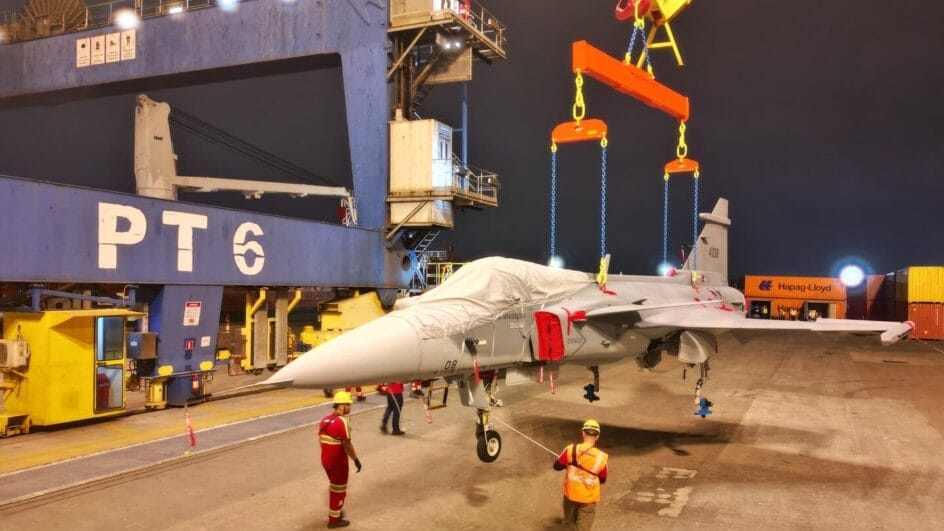 A aeronave foi transportada da Suécia pelo navio Fagelgracht, escolhendo Navegantes por sua infraestrutura e proximidade ao Aeroporto Internacional Ministro Victor Konder.