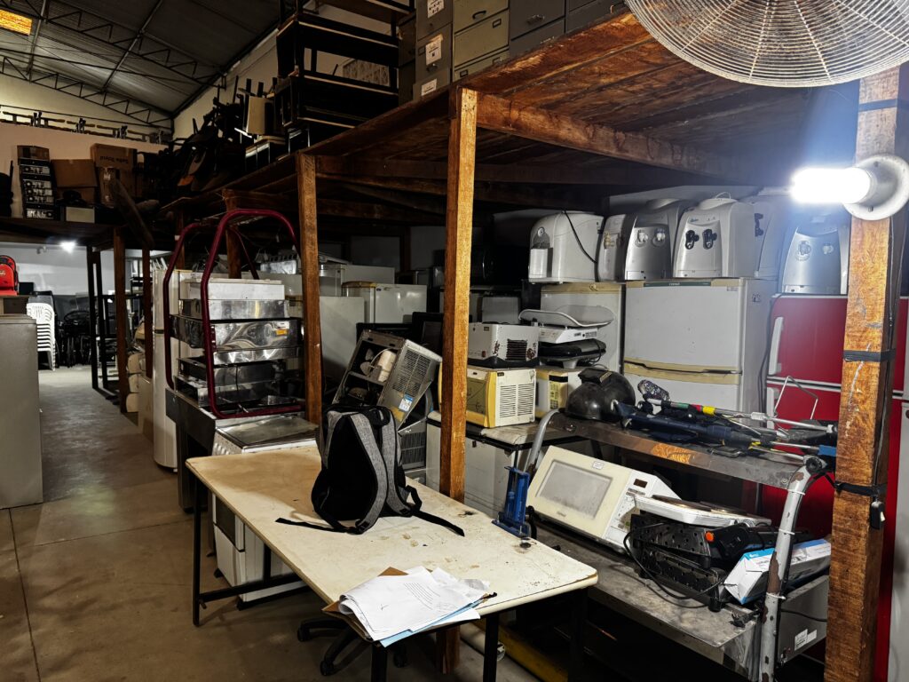Móveis e equipamentos reunidos para doação no galpão da Prefeitura de Itajaí. – Foto: Secom/Reprodução