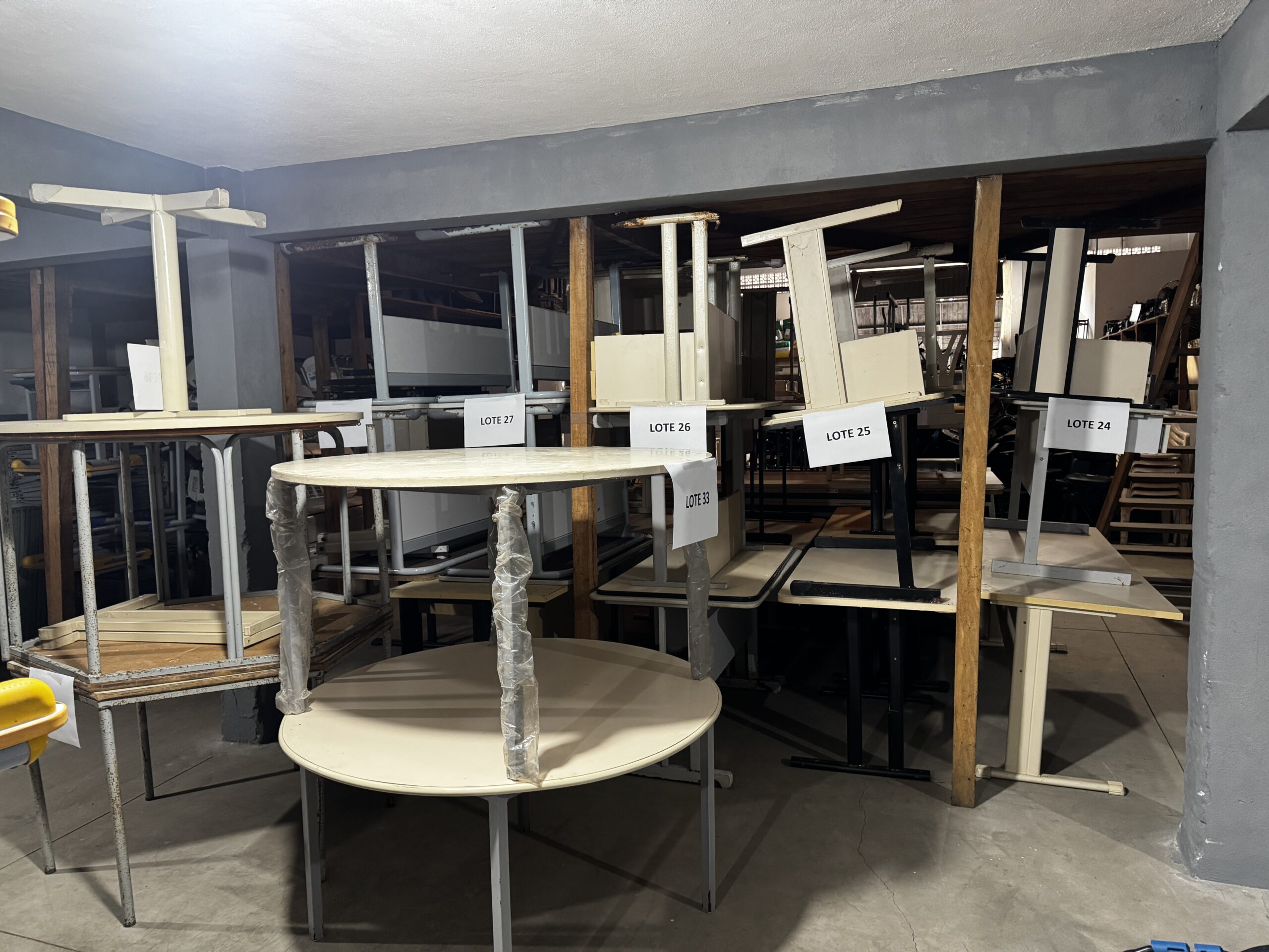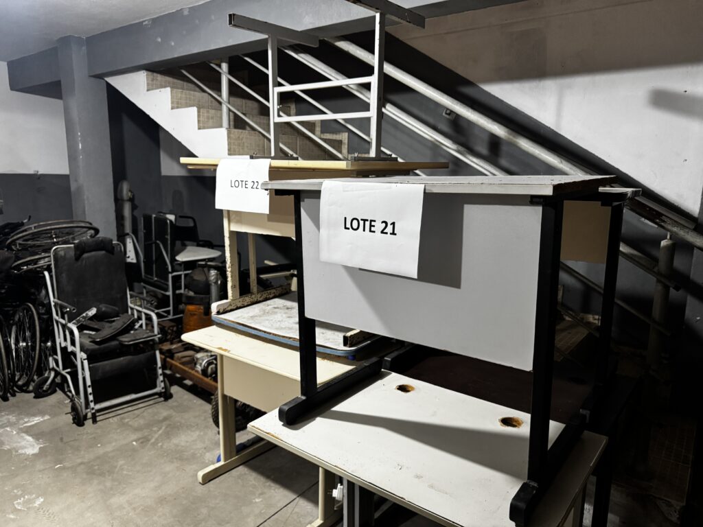 Agora, parte desses materiais será destinada a instituições. Entre os itens disponíveis para doação estão mesas, cadeiras, armários e colchonetes.