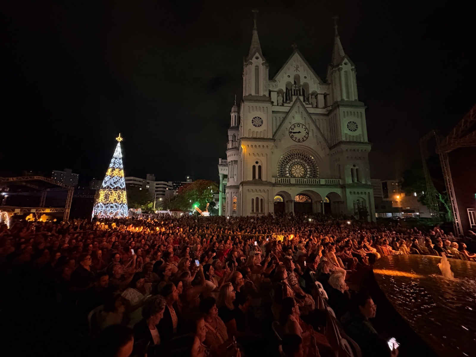 O público ocupou o Largo da Matriz e a rua Hercílio Luz, acompanhando o espetáculo que combinou música, oração e mensagens de esperança com a proximidade do Natal. As atrações do Natal Encanto seguem com programação em diversos bairros da cidade até a próxima terça-feira (23).